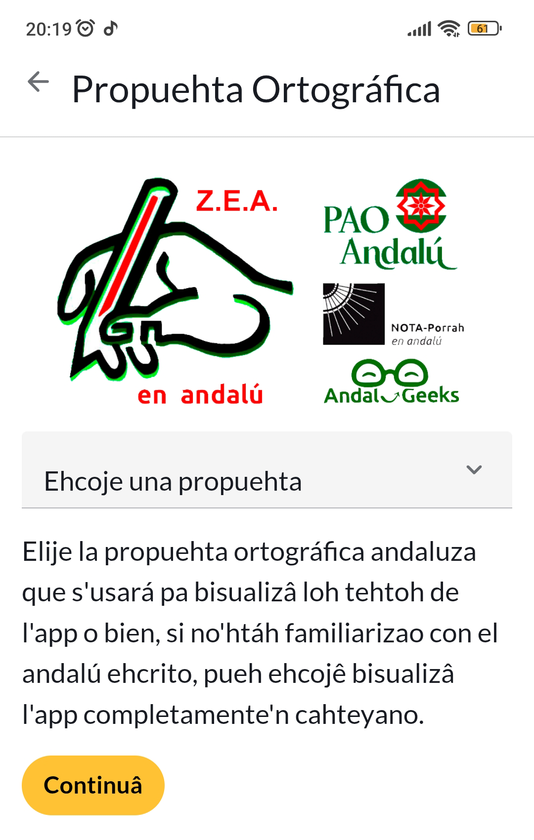 Hoy presentamos la primera aplicación de la Z.E.A. (Sociedad para el Estudio del Andalú) a la que hemos llamado Paisaje Andaluz. Esta aplicación es fruto de la colaboración de nuestra asociación con los siguientes colectivos y/o grupos de estudio: Proyehto PAO, NOTA-Porrah y AndaluGeeks, que puede también enlazarse desde la web de la ZEA.